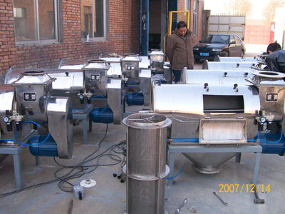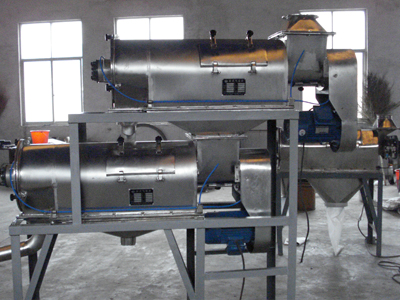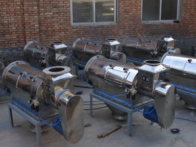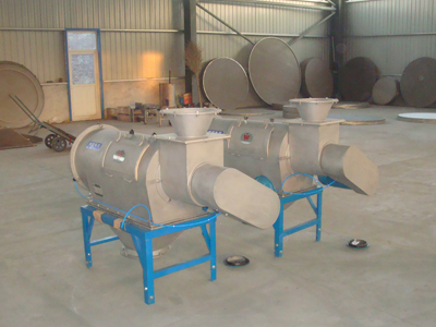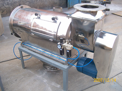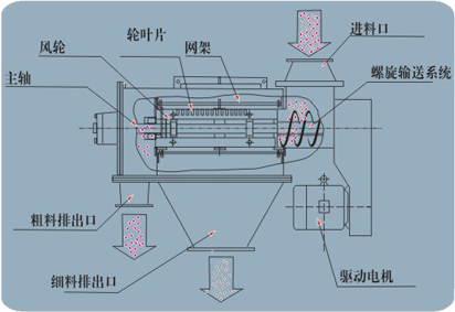 本設(shè)備篩網(wǎng)為圓筒狀,置于機體內(nèi),物料通過螺旋輸送系統(tǒng)后,和氣流混合、霧化進入網(wǎng)筒內(nèi);通過網(wǎng)筒內(nèi)風(fēng)輪葉片使物料同時受離心力和旋風(fēng)推進力,從而迫使物料噴射過網(wǎng),由細料排出口排出,不能過網(wǎng)的物料沿筒壁從粗料排出口排出。